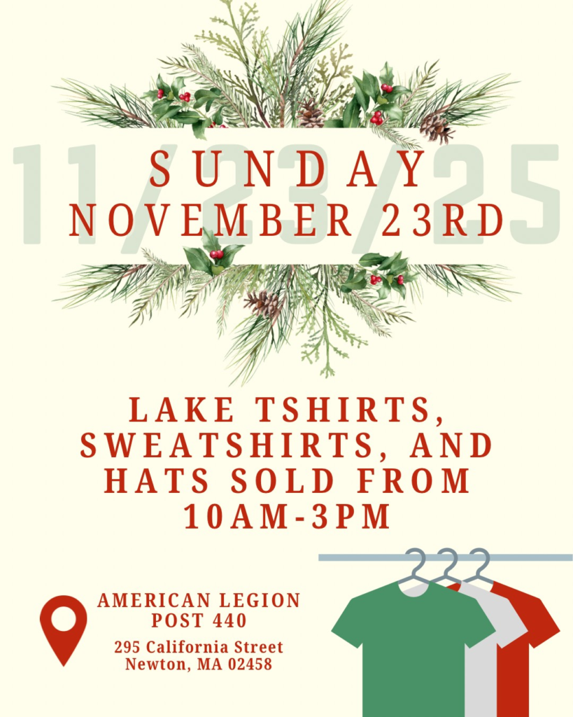 Lake Gear Available at the American Legion Holiday Gift Fair November 16, 2025 / Christmas / By Admin Visit our table at the American Legion Post 440 (295 California St., Newton) Annual Holiday Gift Fair on Sunday, November 23rd, 2025 from 10am – 3pm. We will have ‘The Lake’ T-Shirts, Sweatshirts, and Hats available just in time for Christmas!